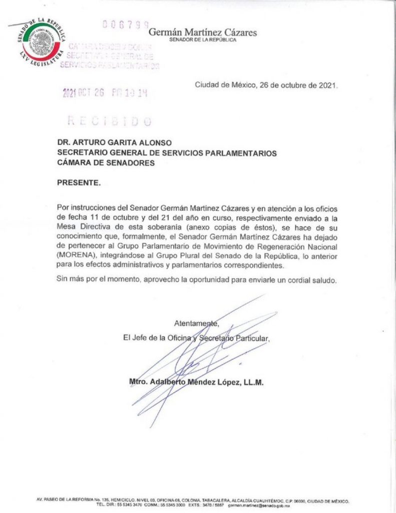 “Se hace de su conocimiento que, formalmente el senador Germán Martínez Cázares ha dejado de pertenecer al Movimiento de Regeneración Nacional (Morena), integrándose al Grupo Plural del Senado de la República, lo anterior para los efectos administrativos y parlamentarios correspondientes”, se lee en el escrito.