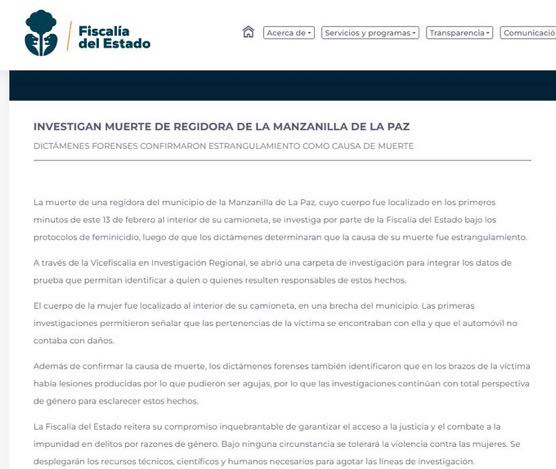 Sin embargo, tras la necropsia, la Fiscalía compartió un comunicado en el que detalló que la regidora fue estrangulada y que el cuerpo de la mujer fue localizado al interior de su camioneta, en una brecha del municipio.