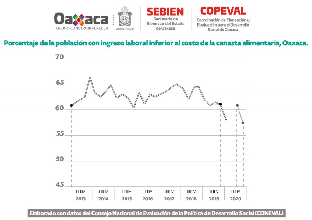 Oaxaca es la entidad con la mayor disminución de porcentaje de su población en pobreza laboral en todo el país, de acuerdo con los resultados del Índice de Tendencia Laboral de la Pobreza (ITLP), correspondientes al cuarto trimestre de 2020, según lo dio a conocer esta mañana el Consejo Nacional de Evaluación de la Política de Desarrollo Social (CONEVAL).
